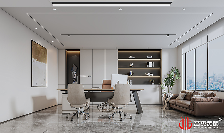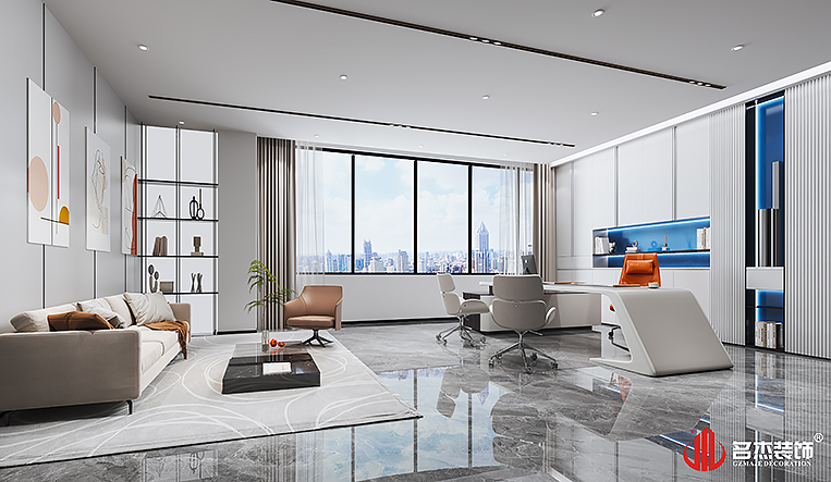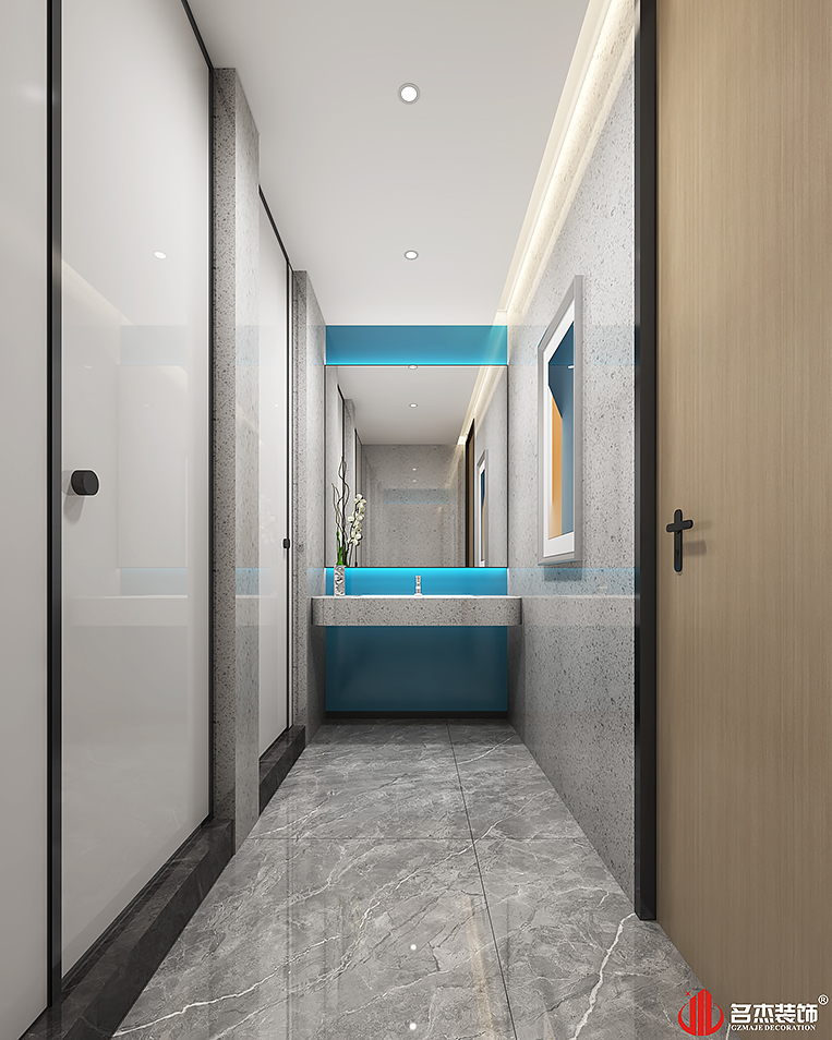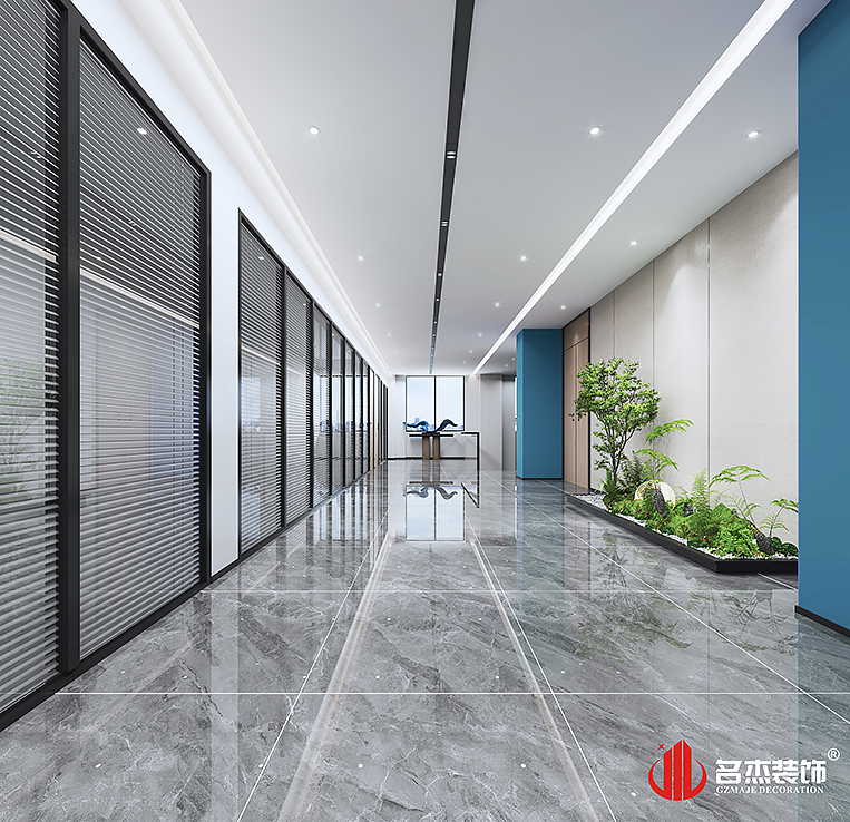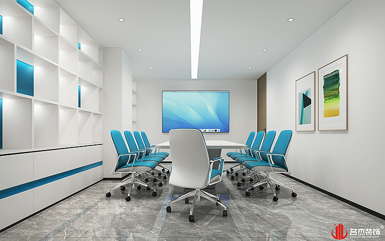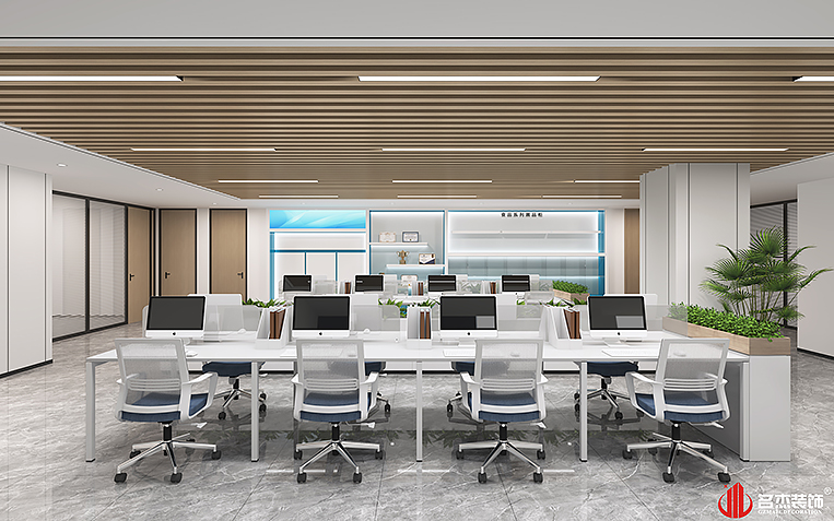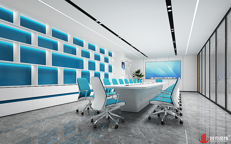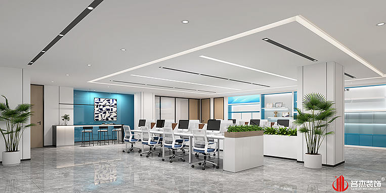 前臺區(qū)域利用層高的優(yōu)勢,搭建出一個大氣且時尚的區(qū)域。在背景墻部分加入部分簡約的且不簡單的元素,讓空間變得更加有層次感,土豪金作為空間的點綴色,也為這個前臺區(qū)域增加了不少的輕奢感。大部分區(qū)域都是做了吊頂?shù)?,通過這樣的方式讓整體風(fēng)格得到了統(tǒng)一,同時這樣簡約的吊頂也能夠給空間帶來不一樣的層次感??臻g中藍(lán)色點綴也是隨處可見的,能夠很好的感受到企業(yè)文化。#工裝裝修#