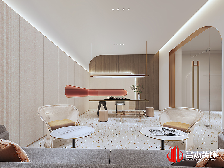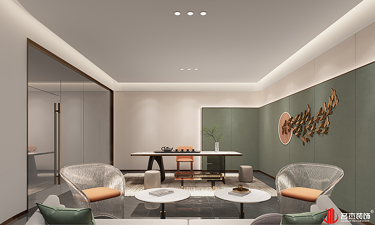 在前臺區(qū)域使用圓頂造型的天花來作為整個辦公室裝修設(shè)計空間的點睛之筆,同時配波浪板的背景墻,讓人有一種仿佛置身大海一般。在接待室里面選擇性地使用圓弧線條,加以莫蘭迪色系以及護墻板的,燈帶的恰到好處地使用,讓接待室的休閑感和柔和感更加濃郁。而在另一個接待室則是采用不一樣的設(shè)計處理手法,以直的元素作為主打元素,同時也搭配莫蘭迪色系作為點綴色系,也更突出空間的休閑感。