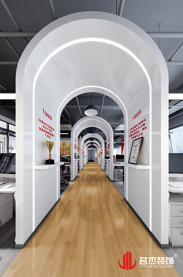 在前臺(tái)裝修設(shè)計(jì)的時(shí)候,燈帶的加入讓空間中充滿了不一樣的設(shè)計(jì)感,而且在辦公區(qū)域的過(guò)道旁邊,加入了時(shí)光隧道的設(shè)計(jì)元素,讓整個(gè)企業(yè)的發(fā)展歷程都能隨時(shí)讓人看見,企業(yè)文化也不知不覺中融入到整體的環(huán)境中。