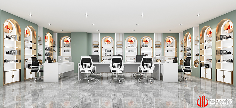 這次美業(yè)紋飾案例中使用的是時(shí)下流行的潮流元素,結(jié)合該行業(yè)是接觸時(shí)尚前端的行業(yè),也是一個(gè)能夠突出美的行業(yè),對(duì)此設(shè)計(jì)團(tuán)隊(duì)使用莫蘭迪色系來(lái)作為展廳空間的主色調(diào),強(qiáng)調(diào)時(shí)尚元素的同時(shí),還能夠讓空間增加更多的設(shè)計(jì)感。利用吊飾吊燈來(lái)作為空間的點(diǎn)睛之筆,空間感強(qiáng)烈的同時(shí),還能夠讓空間的層次感更加突出。
