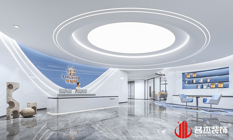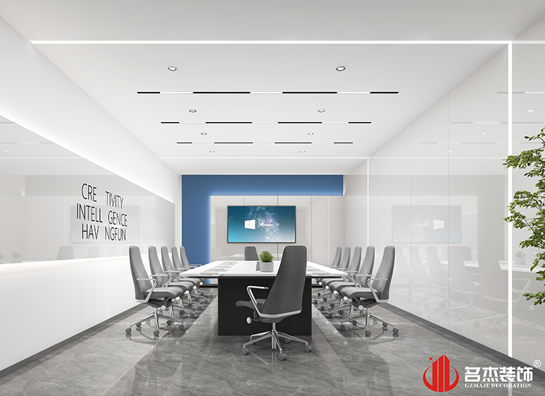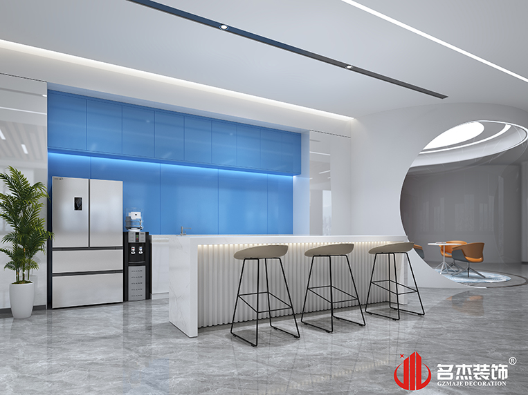整體使用時(shí)尚簡約的風(fēng)格,讓辦公空間看起來更加簡潔,同時(shí)在不同區(qū)域使用藍(lán)色作為點(diǎn)綴色,給空間增添了幾分科技感的同時(shí),也讓空間變得不那么單調(diào)。前臺(tái)區(qū)域使用圓弧造型的吊頂,搭配弧線形的背景墻,形成一種呼應(yīng)的同時(shí),還能夠增加前臺(tái)空間的層次感。在辦公區(qū)域使用藍(lán)色噴漆,區(qū)別于傳統(tǒng)的黑白灰,讓空間更加具有辨識(shí)度。