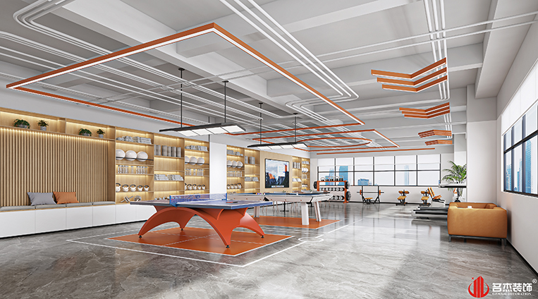 這次的主打風(fēng)格是時(shí)尚簡約風(fēng)格,前臺背景墻區(qū)域采用漸變的方式,以及在天花上面使用不銹鋼水波紋蜂窩板來為這個(gè)空間增添不少設(shè)計(jì)感。而在健身區(qū)使用橙色作為空間的點(diǎn)綴色,暖黃色作為背景墻,和橙色形成一種呼應(yīng)。#廣州辦公室裝修設(shè)計(jì)#