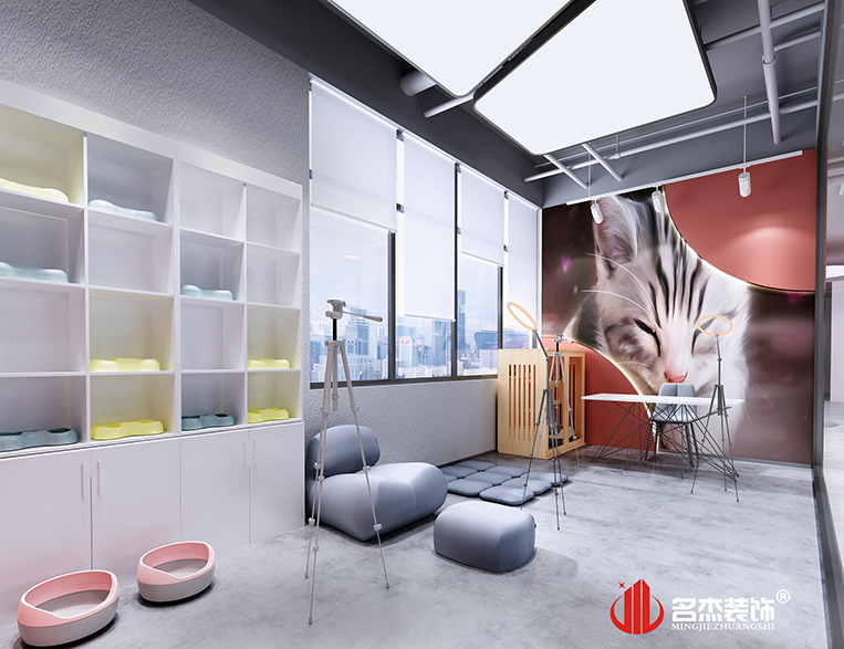 此案例是一家寵物用品店,設(shè)計(jì)師按照客戶的要求再結(jié)合該行業(yè)的特點(diǎn),使用了略帶工業(yè)風(fēng)格的來做為主基調(diào),利用暖色調(diào)的家具和燈光來調(diào)節(jié)工業(yè)風(fēng)中的冷。直播間背景墻直接使用了貓咪圖做背景圖,使用兩個(gè)圓弧來進(jìn)行裝飾。