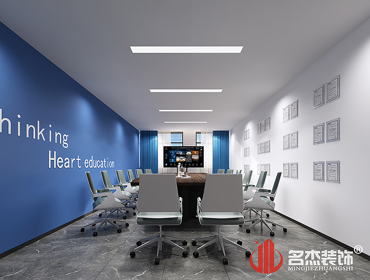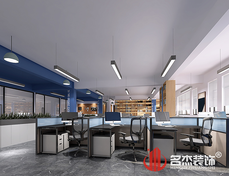 整體的辦公區(qū)域加入了藍色色調(diào)作為跳色的設計元素,也與企業(yè)LOGO的顏色相互呼應。部分區(qū)域也采用了弧形元素來增加整體的設計感,讓整個辦公室裝修設計更加具有時尚感。