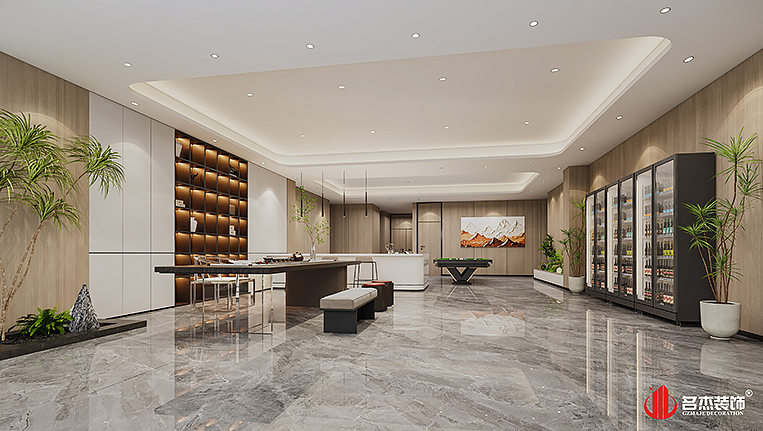 空間中的前臺接待區(qū)域使用造景的設(shè)計手法,來突出風(fēng)生水起的設(shè)計重點,配合前臺背景墻使用的碳晶板,以及燈條作為點綴設(shè)計元素,搭配出不一樣的裝修設(shè)計效果。對于棋牌休閑空間來說,燈光是非常重要的元素之一,因此設(shè)計團隊也著重在這方面上的設(shè)計,通過使用造型不同的燈具,為空間增加了不少的時尚潮流感。#廣州公裝裝修公司#
